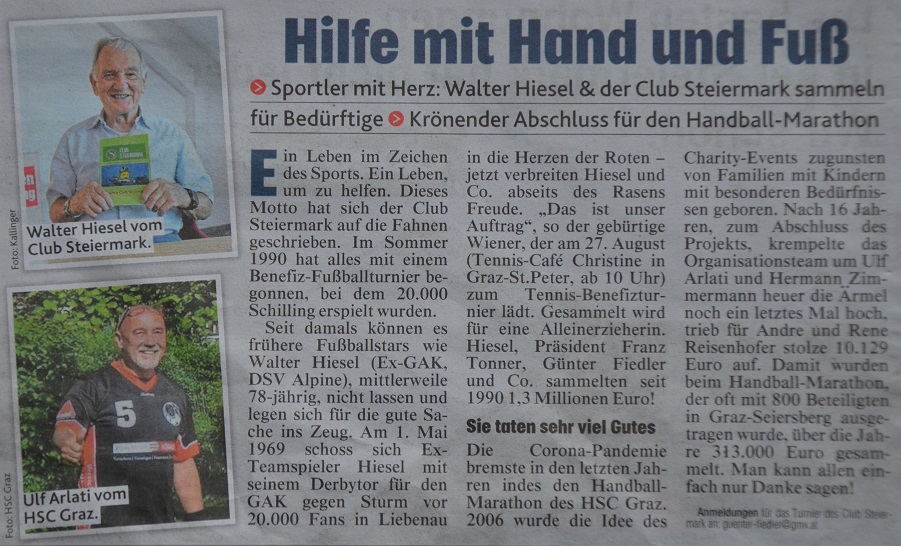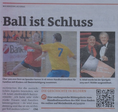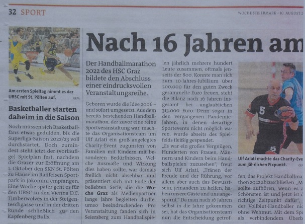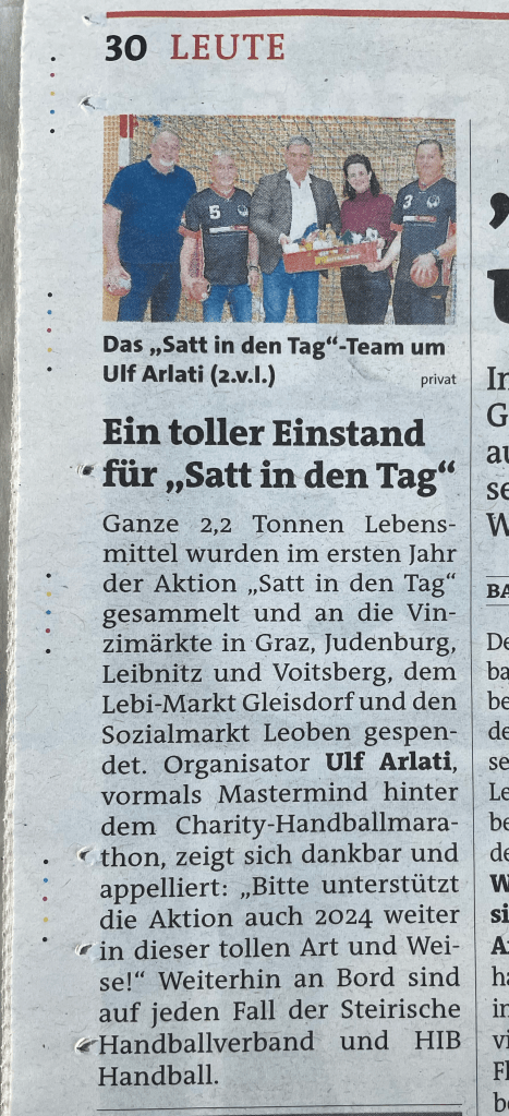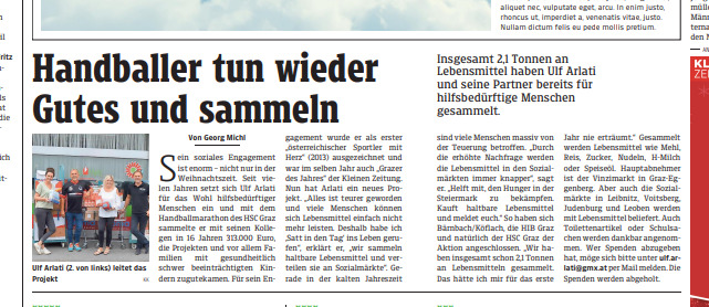 Pressemeldungen über den erfolgreichen Charity Handballmarathon des HSC Graz und seinem Nachfolger-Projekt „Satt in den Tag„.
